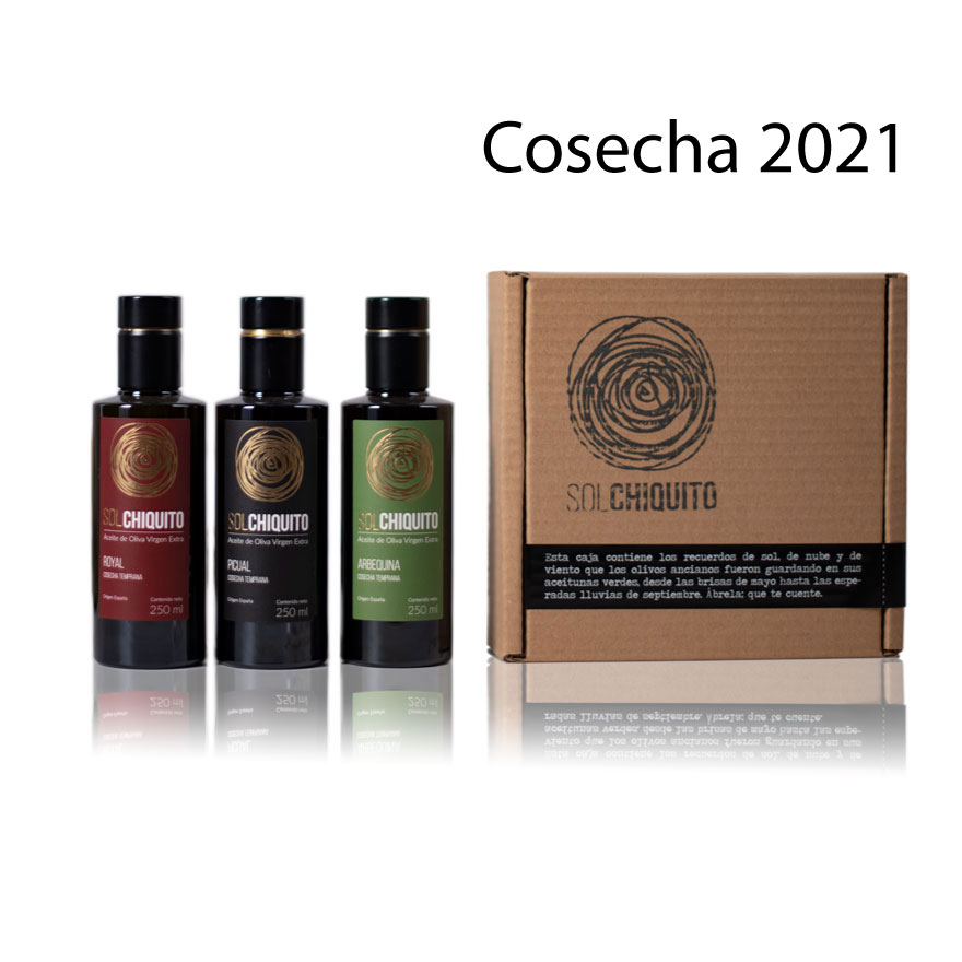 Early harvest extra virgin olive oil gift box that contains picual, royal and arbequina varieties in three 250 ml bottles, ideal to give a gift, full of health and aromas, to your family, friends, clients or employees.