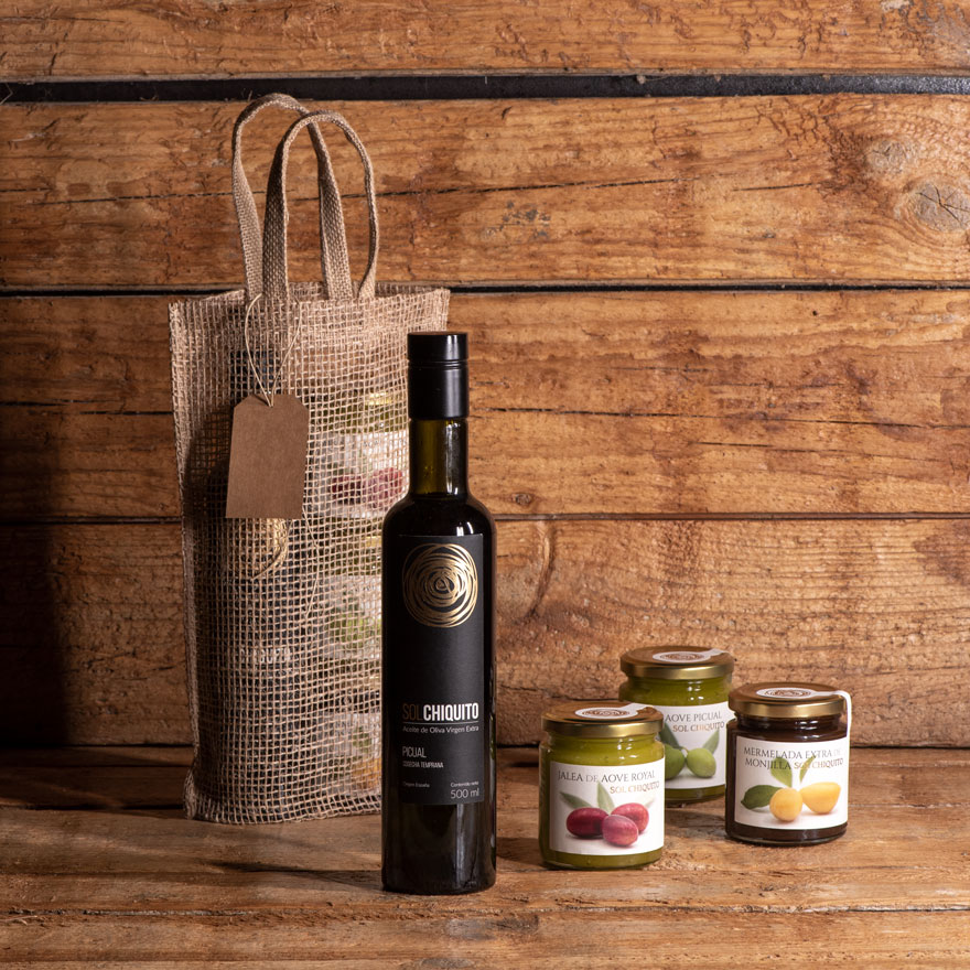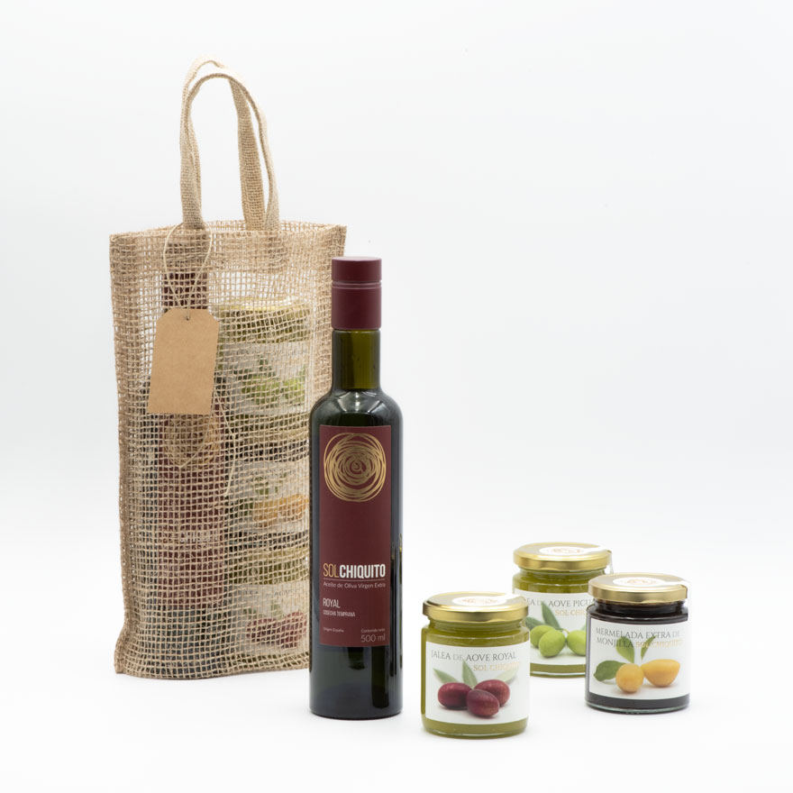 Un pack compuesto de aceite de oliva virgen extra Sol Chiquito de COSECHA TEMPRANA ROYAL, mermelada de ciruela MONJILLA, jalea de AOVE ROYAL y jalea de AOVE PICUAL, con bolsa de yute doble, con etiqueta colgante personalizable, ideal para regalo.